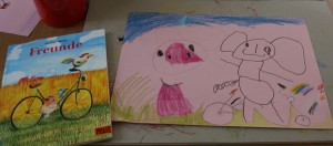 im kindergarten hatten sie letzte woche schon mal das buch „freunde“ gelesen und dazu gemalt. das „mussten“ wir heute hier auch noch mal machen. interessant. der dicke waldemar ist eine mischung aus abmalen und intuition (oder archetyp oder wie auch immer man es nennen mag). beim schwarzen mund hat er irgendwie den überblick verloren… johnny mauser ist „aus dem kopf“ gemalt (so mag ich kinderbilder am liebsten, weil es die „wahren“ figuren sind wie kinder sie wahrnehmen, bzw. was für sie wichtig ist. ). und der hahn ist komplett „abgemalt“. den finde ich sehr verwunderlich, weil da so gar nichts typisch kindliches dran ist…